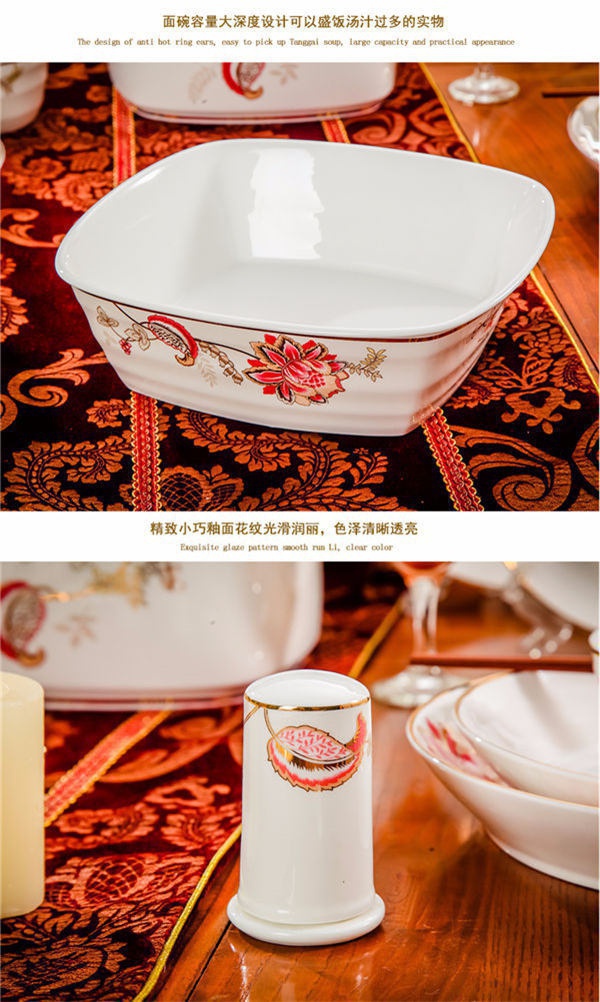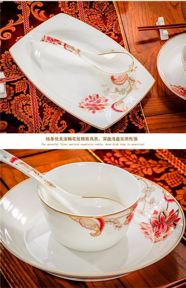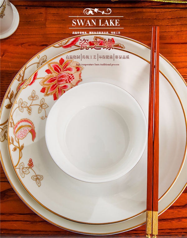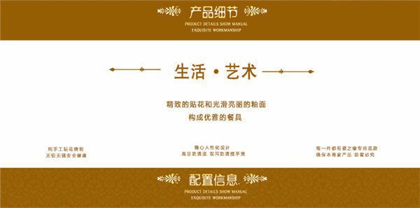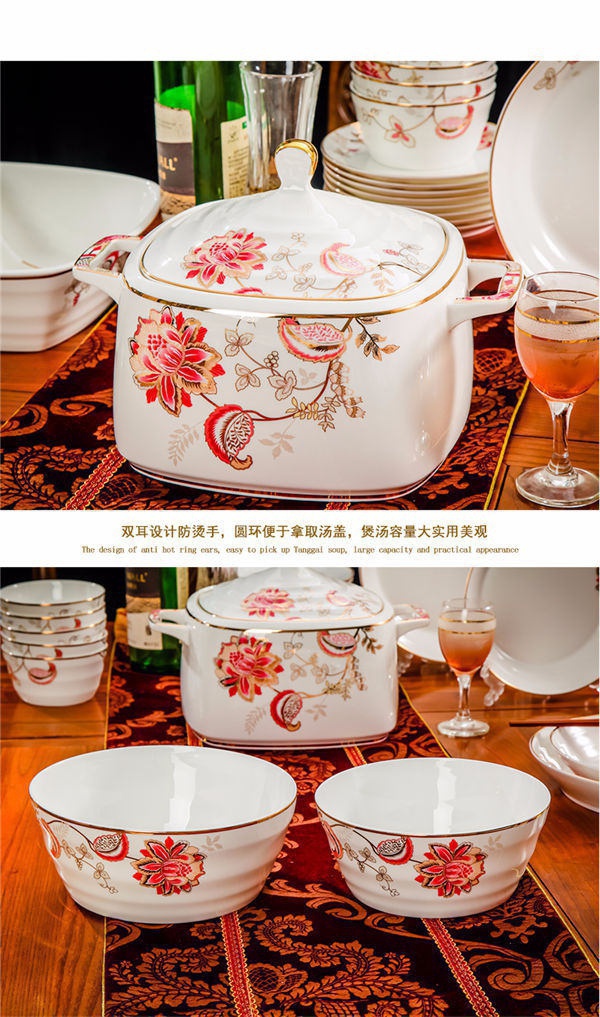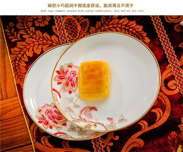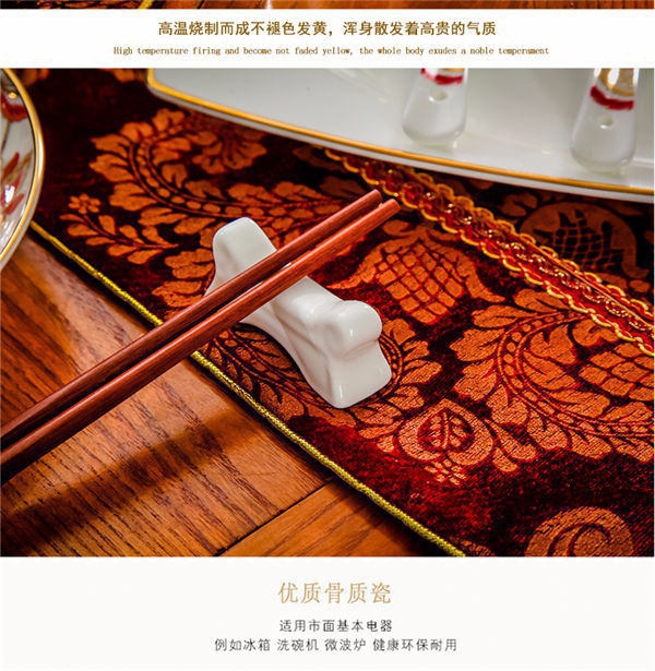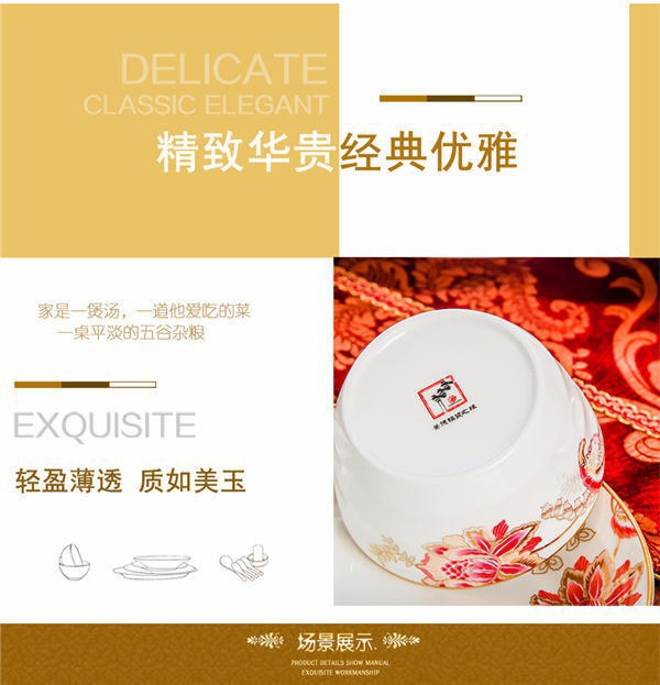 65頭醉花吟,一個(gè)湯煲,一個(gè)魚盤,一個(gè)大飯勺,一個(gè)大湯碗,一個(gè)牙簽筒,六個(gè)面碗,四個(gè)三寸碟,十個(gè)盤子,十個(gè)4.5寸飯碗,十個(gè)五寸骨碟,十個(gè)調(diào)羹,十個(gè)筷子架。