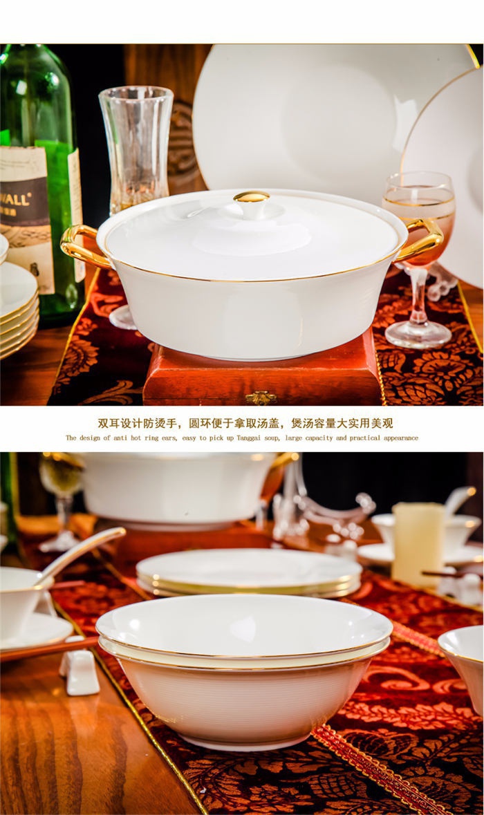 58頭頭金邊螺,一個湯煲,一個魚盤,一個十寸圓盤,一個飯勺,一個煙灰缸,一個牙簽筒,兩個面碗,十個4.5寸飯碗,十個五個五寸骨碟,十個八寸盤,十個調(diào)羹,十個筷子架。58頭頭金邊螺,一個湯煲,一個魚盤,一個十寸圓盤,一個飯勺,一個煙灰缸,一個牙簽筒,兩個面碗,十個4.5寸飯碗,十個五個五寸骨碟,十個八寸盤,十個調(diào)羹,十個筷子架。