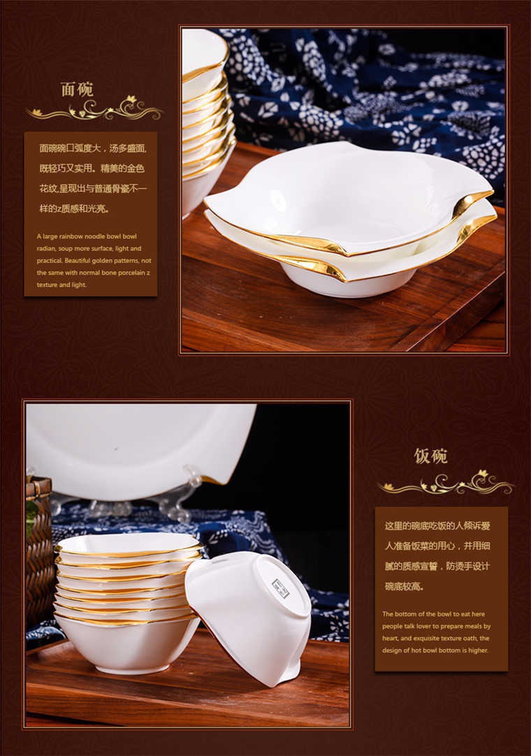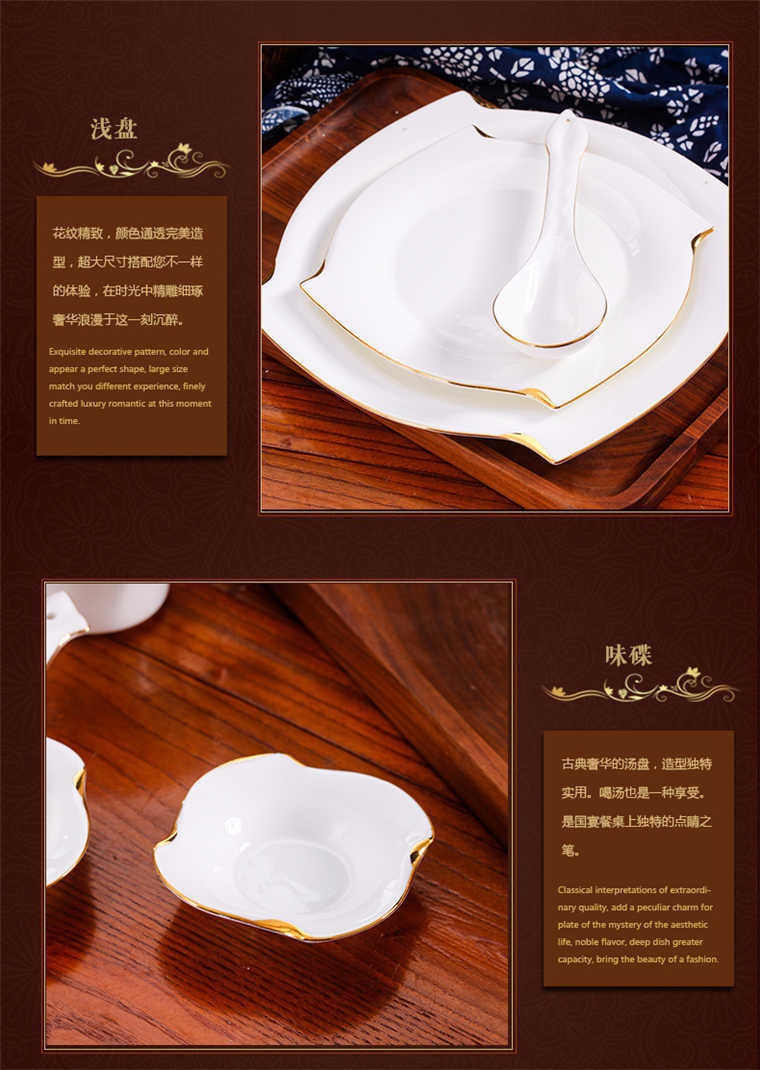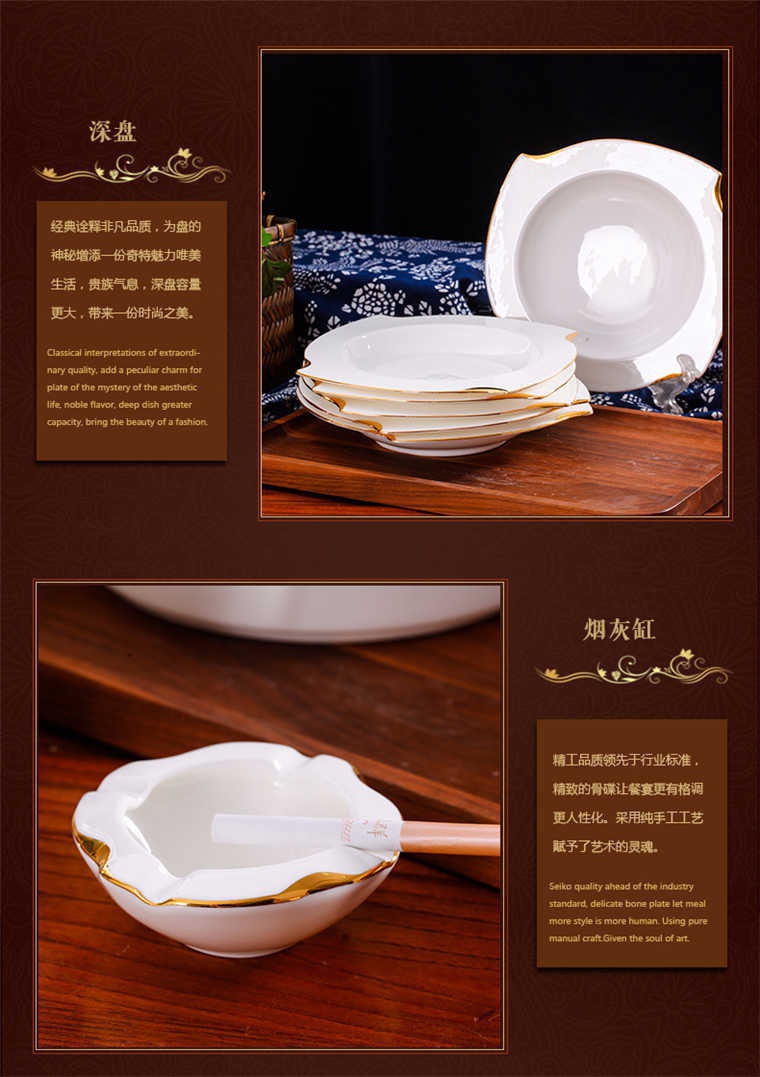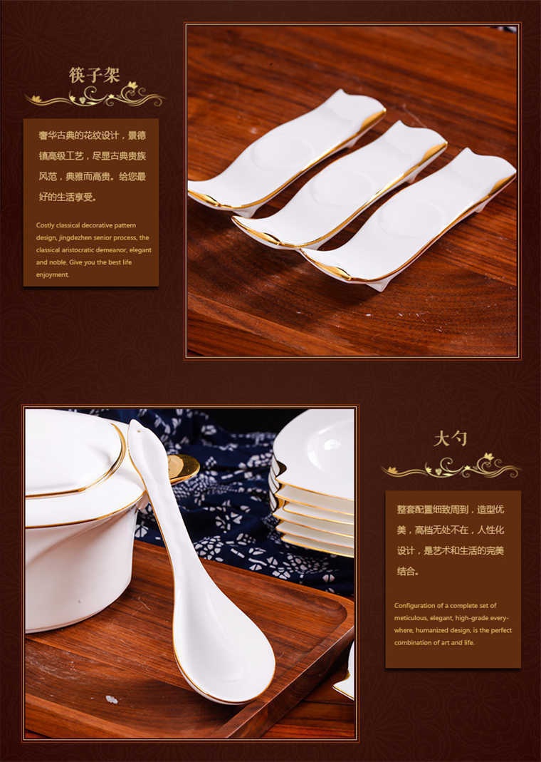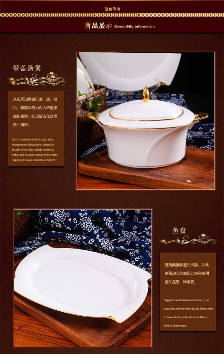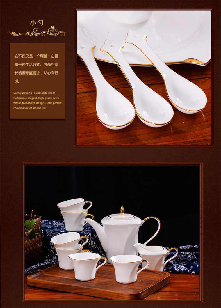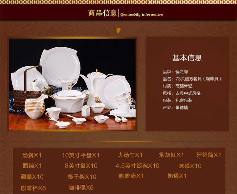 73頭旋方帶咖啡具,餐具一個(gè)湯煲,一個(gè)魚盤,一個(gè)十寸平盤,一個(gè)大湯勺,一個(gè)煙缸,一個(gè)牙簽筒,兩個(gè)面碗,十個(gè)八寸盤,十個(gè)4.5寸飯碗,十個(gè)味碟,十個(gè)調(diào)羹,十個(gè)筷子架。咖啡具一個(gè)咖啡壺,一個(gè)糖缸,一個(gè)奶罐,六個(gè)杯子,六個(gè)碟子。