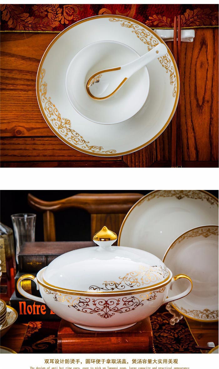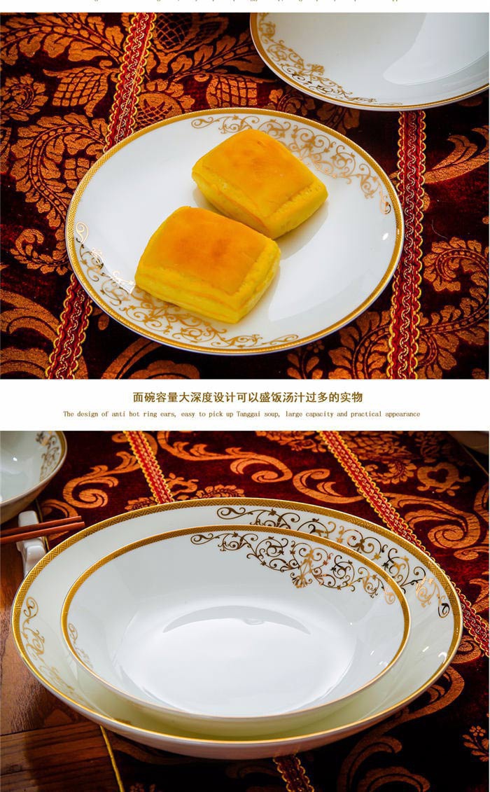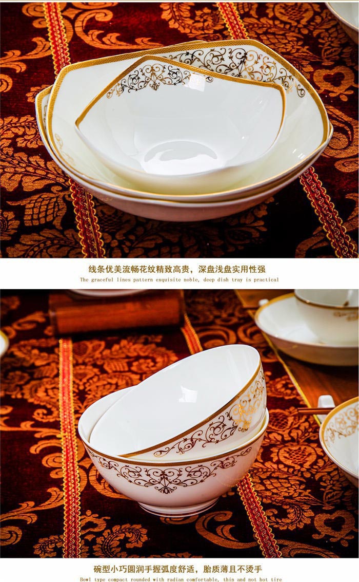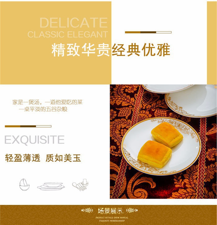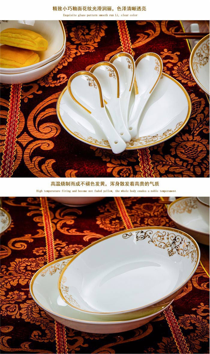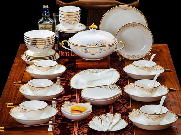 60頭相思,一個湯煲,一個魚盤,一個10寸大圓盤,一個飯勺,兩個沙拉碟,四個面碗,十個4.5寸飯碗,十個5寸骨碟,八個8寸圓盤,兩個8寸方盤,十個調羹,十個筷子架。