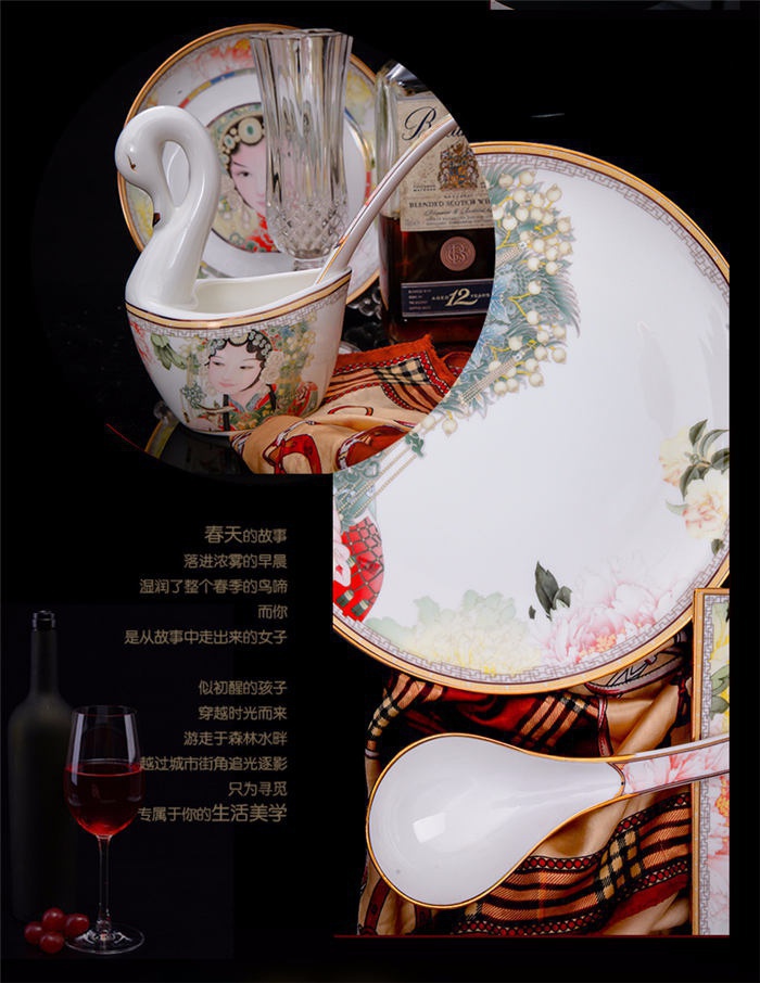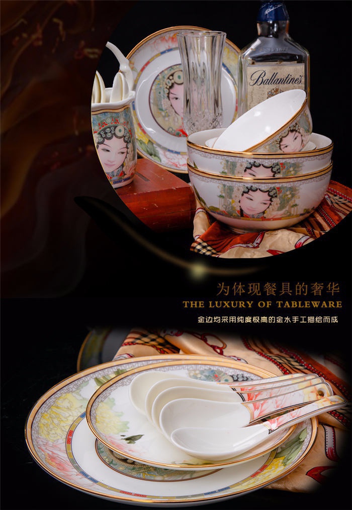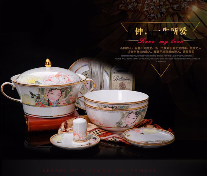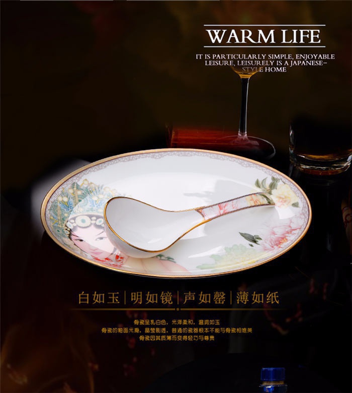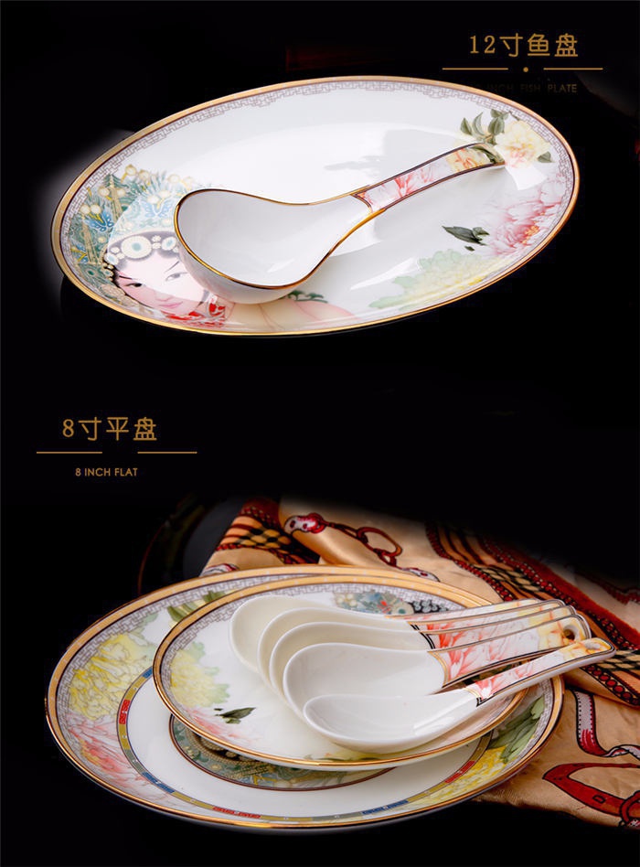 60頭臉譜,一個(gè)湯煲,一個(gè)飯勺,一個(gè)魚盤,一個(gè)十寸平盤,一個(gè)牙簽筒,一個(gè)煙灰缸,兩個(gè)面碗,兩個(gè)大湯碗,一個(gè)花籃,一個(gè)鳥,八塊八寸盤,十個(gè)4.5寸飯碗,十個(gè)骨碟,十個(gè)調(diào)羹,十個(gè)筷子架。