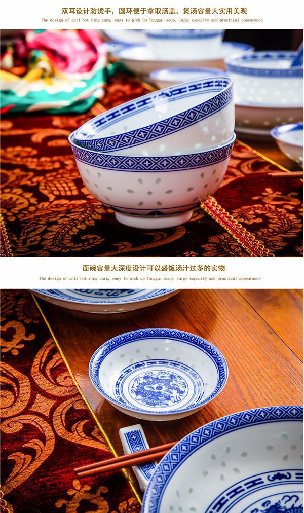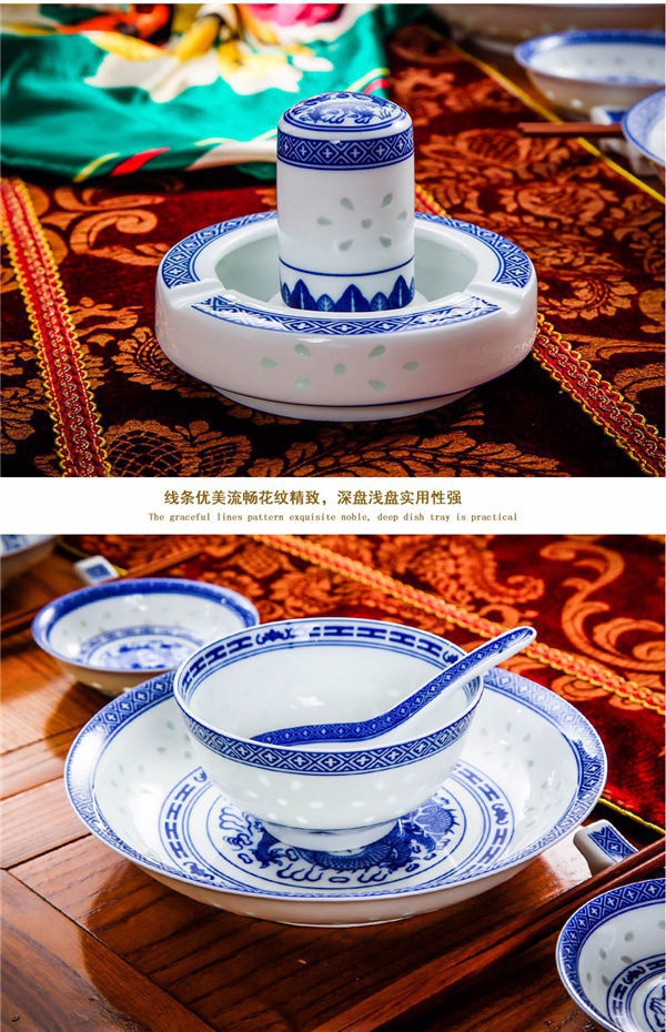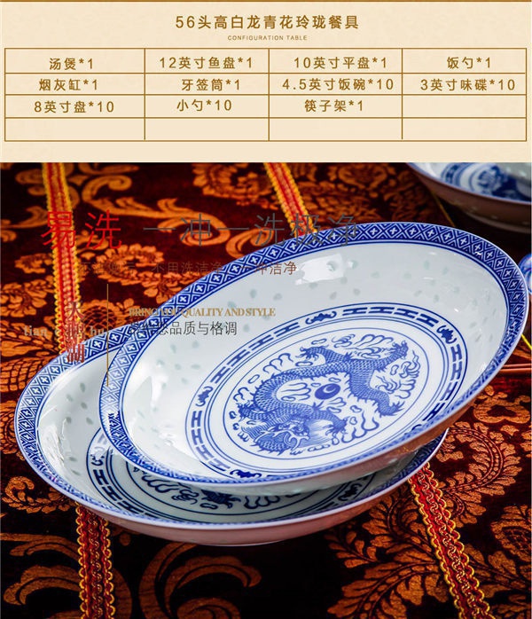 56頭高白龍的青花玲瓏餐具,一個湯煲,一個魚盤,一個十寸圓盤,一個飯勺,一個煙缸,一個牙簽筒,十個4.5寸飯碗,十個三寸碟,十個八寸盤,十個調羹,十個筷子架。56頭高白龍的青花玲瓏餐具,一個湯煲,一個魚盤,一個十寸圓盤,一個飯勺,一個煙缸,一個牙簽筒,十個4.5寸飯碗,十個三寸碟,十個八寸盤,十個調羹,十個筷子架。