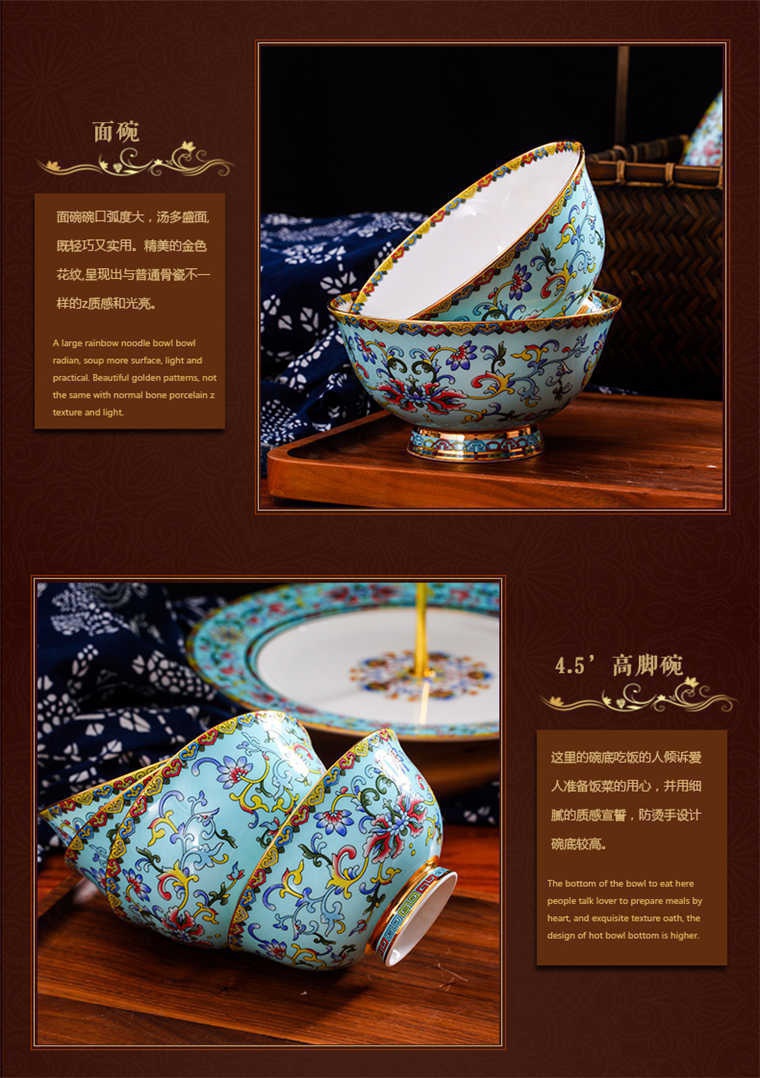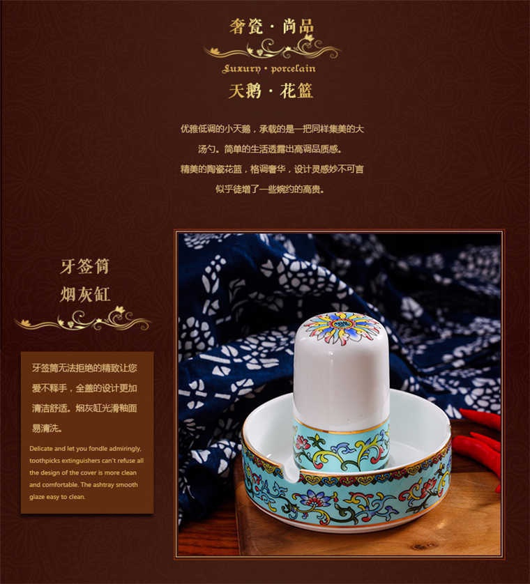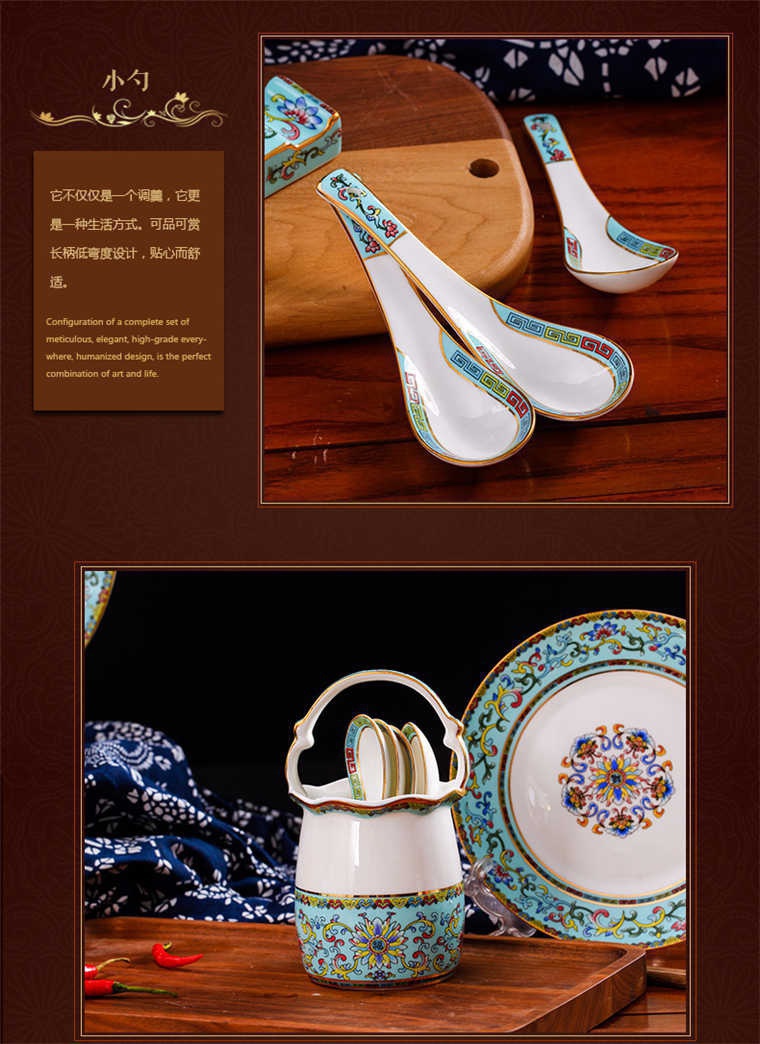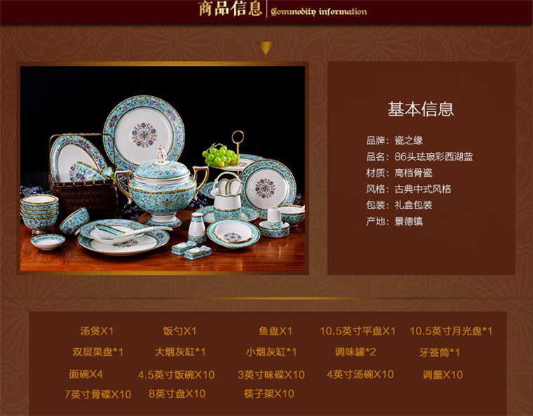 86頭琺瑯彩西湖藍,一個湯煲,一個飯勺,一個魚盤,一個10.5寸平盤,一個10.5寸月光盤,雙層果盤一個,一個大煙缸,一個小煙缸,二個調(diào)料罐,一個牙簽筒,四個面碗,十個4.5寸飯碗,十個三寸調(diào)味碟,十個4寸湯碗,十個調(diào)羹,十個7寸骨碟,十個八寸盤,十個筷子架.